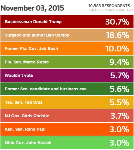 Illustration of the Day: After last week’s CNBC debate, we got another glimpse into voters’ support for candidates. It was pretty much the same: strong support for Donald Trump and Ben Carson, and less support for everyone else, particularly for Rand Paul, Chris Christie and John Kasich (chart/poll by Reuters).