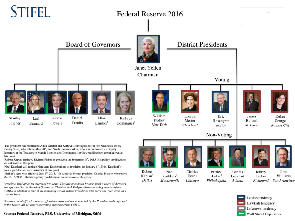 Stifel, an investment banking firm headquartered in San Francisco, California, has released a Federal Reserve 2016 tree (via Economic Policy Journal). It looks at Fed Chair Janet Yellen, Board of Governors, District Presidents and are identified by dovish, hawkish, Wall Street experience and unknown.